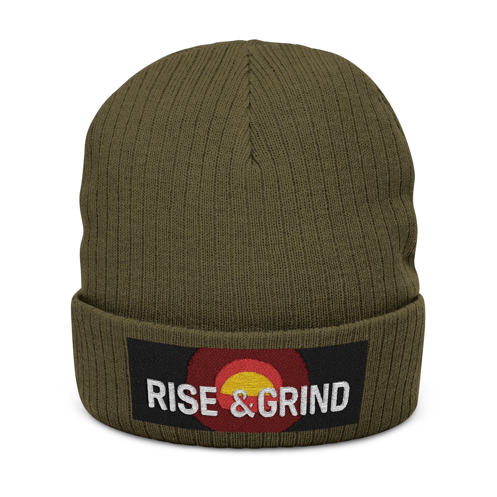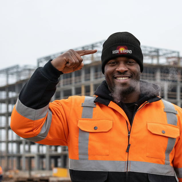 Dynamic Design: Featuring a stunning sunrise graphic over a city skyline, paired with the bold slogan "Rise & Grind," this beanie embodies the spirit of hustle and determination, reminding you to seize each day.